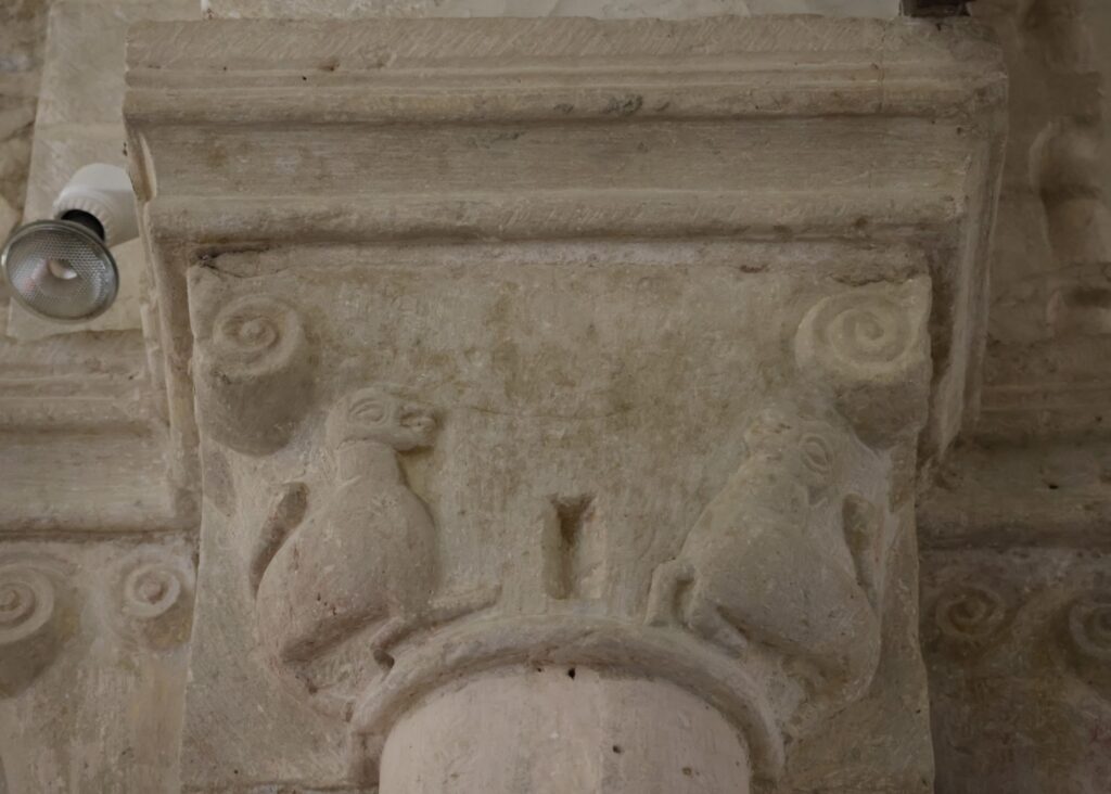 はっきり見えませんが、中央の柱頭では、リスが木の葉を食んでいるのだそう。