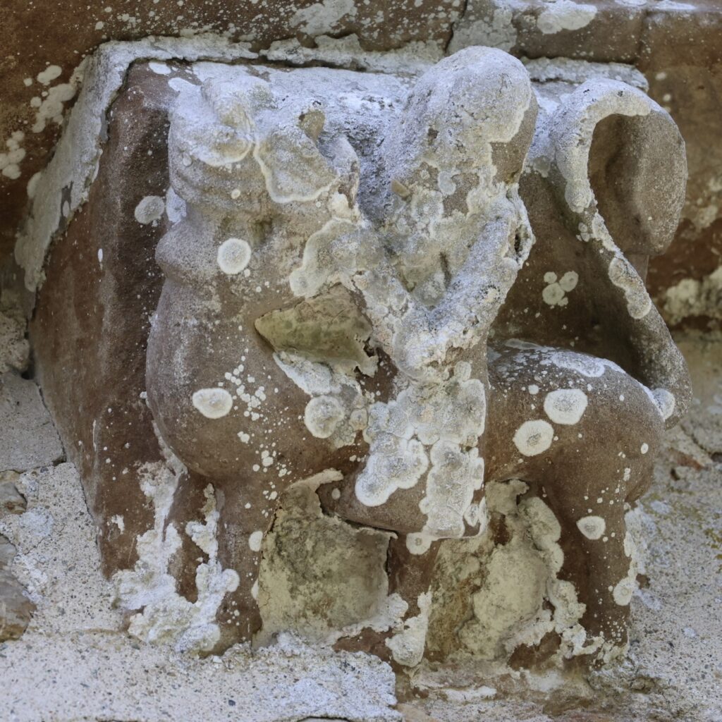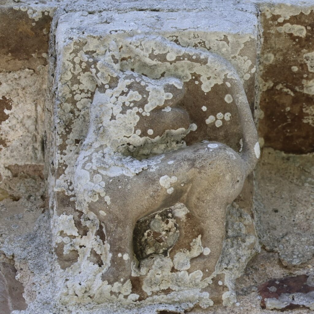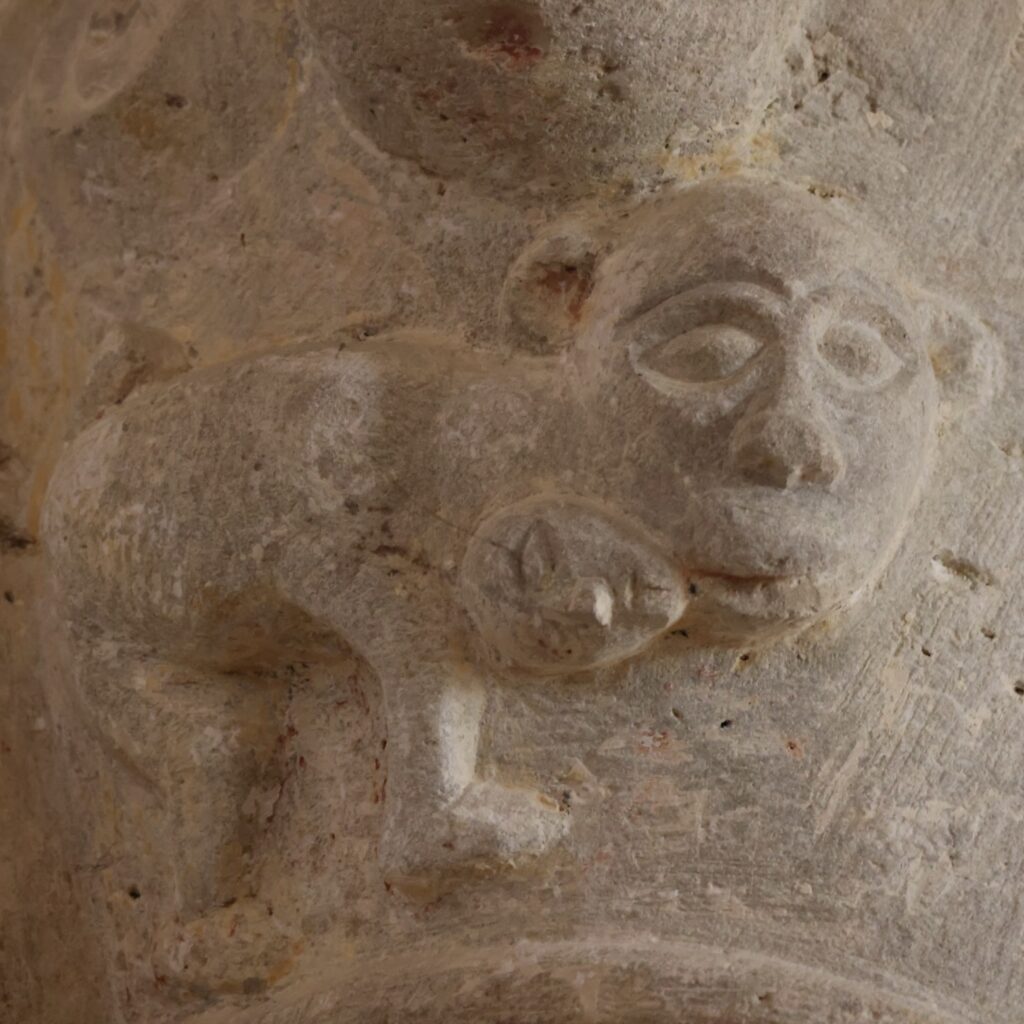 勝利アーチの柱頭は、左(北)側に四つ足で歩く2匹の猿が彫られています。