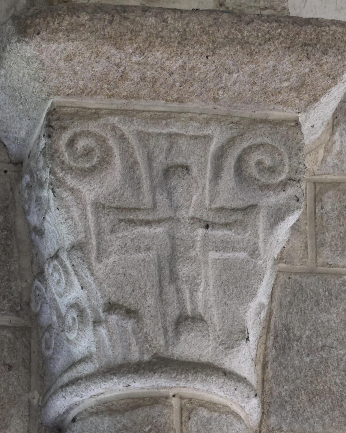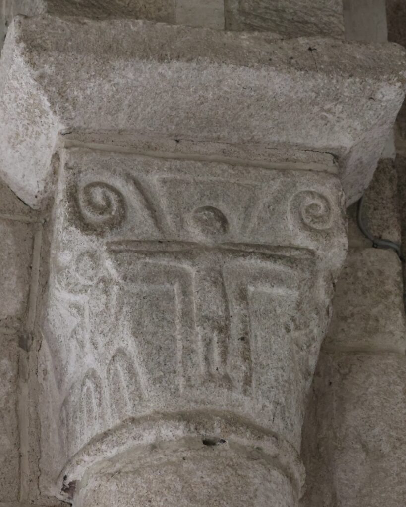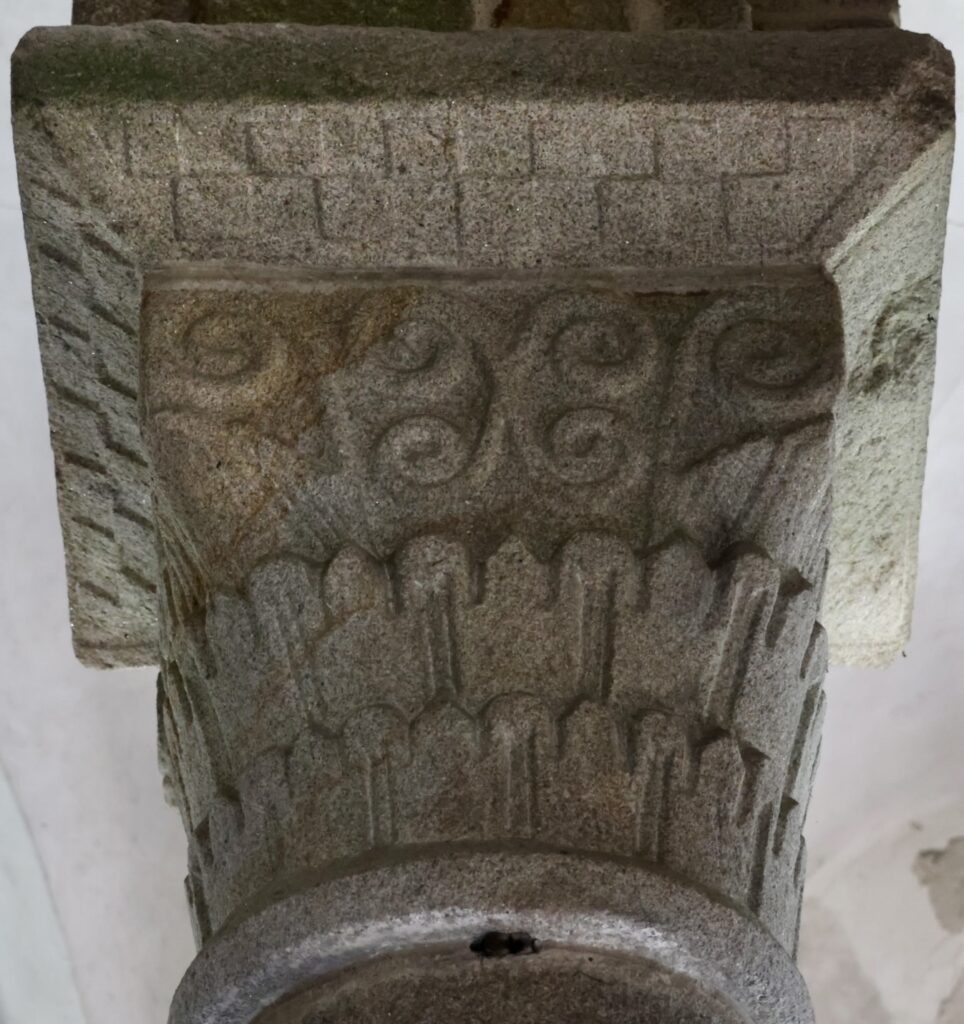 左(北)側から最初の柱頭は、中央の上部に、先がくるりと丸くなった「X」の文字のような形が彫られています。