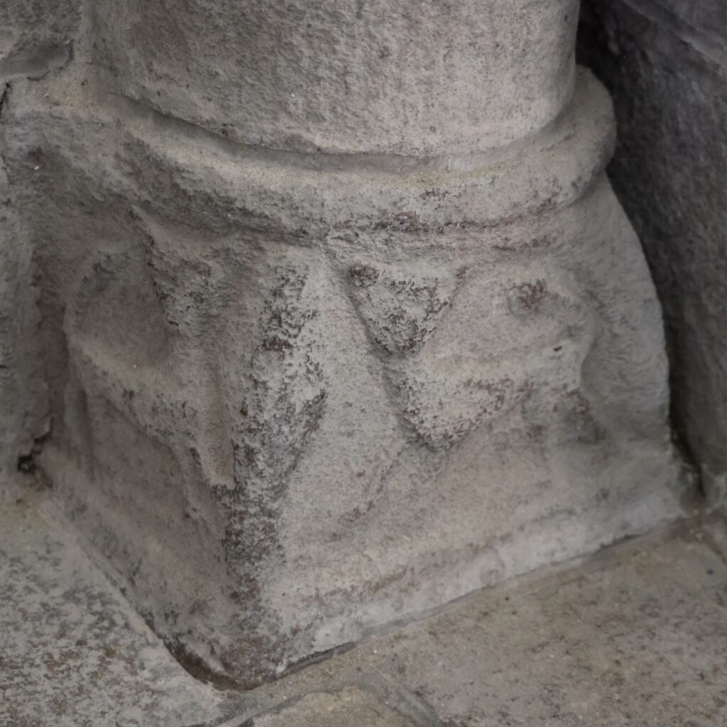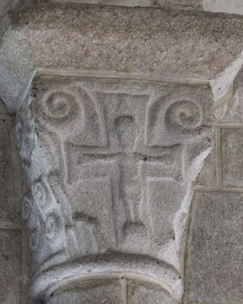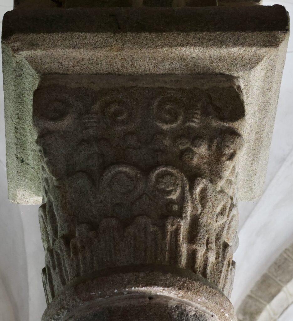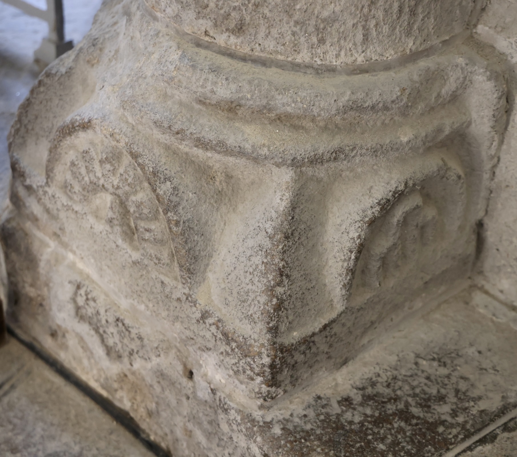 左(北)側から最初の柱頭は、中央の上部に、先がくるりと丸くなった「X」の文字のような形が彫られています。