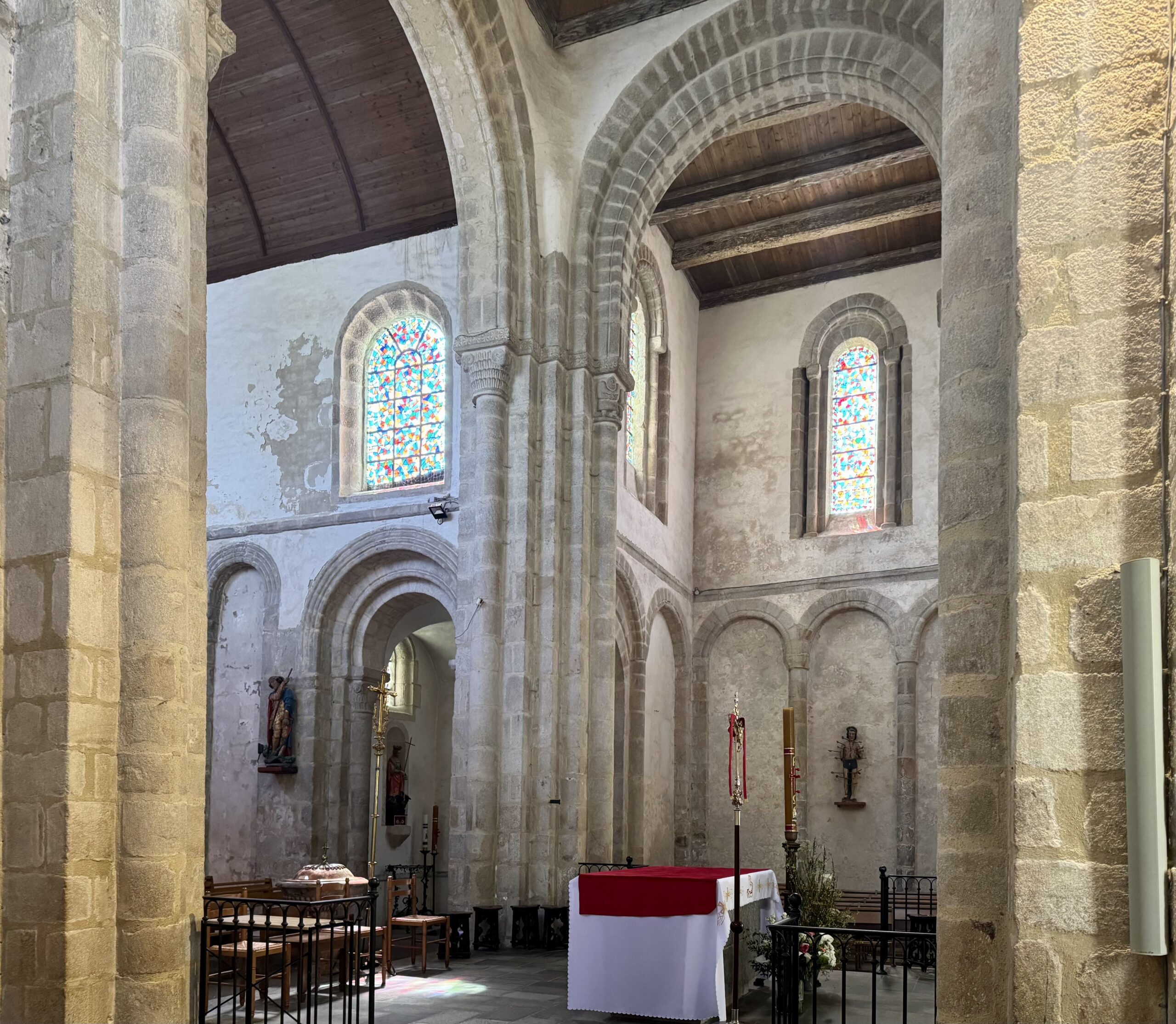 南北の翼廊の壁にも、クワイヤの南壁と同じような盲アーケードがあります。翼廊には、小さな柱を持つロマネスク様式の窓がいくつか残っています。