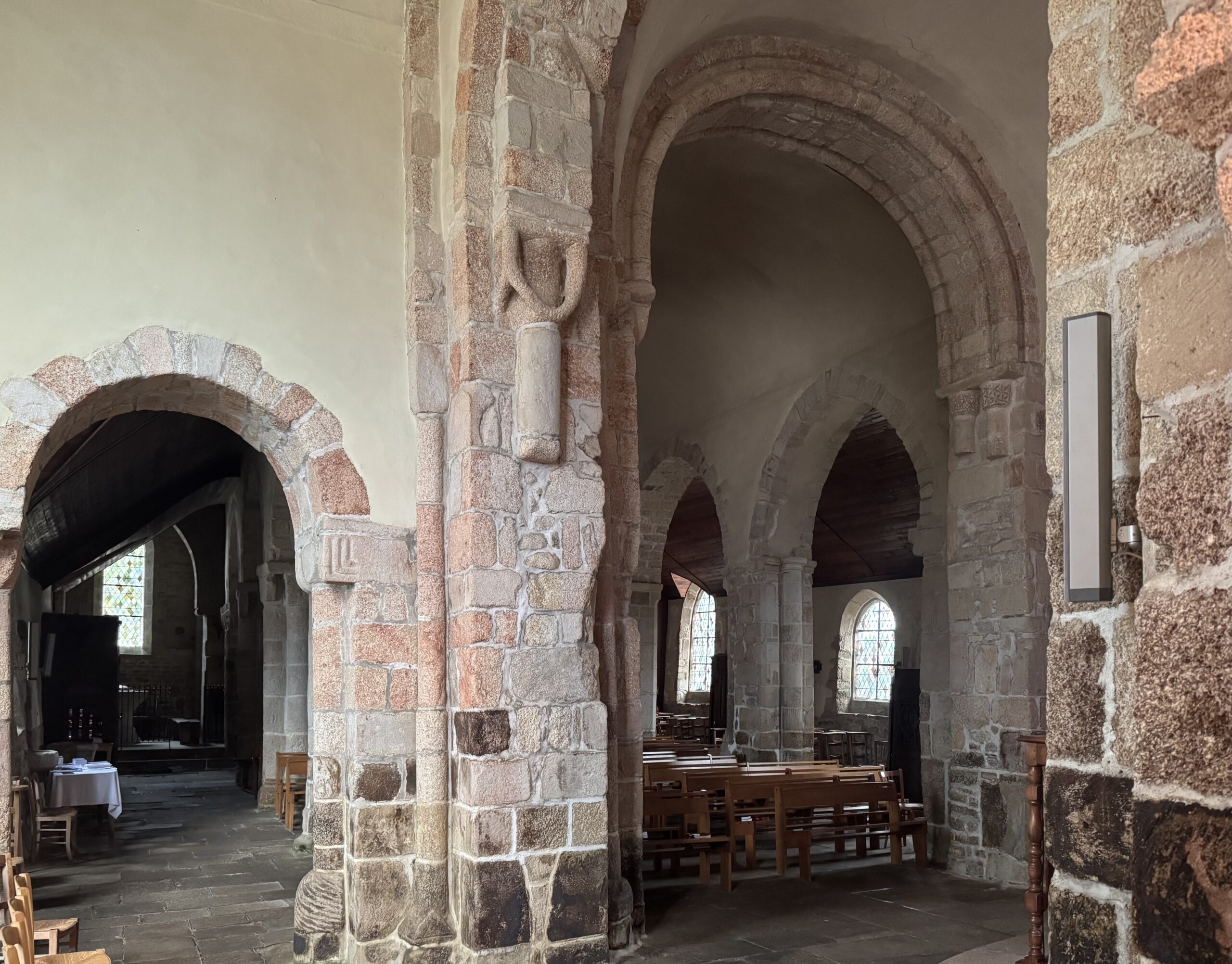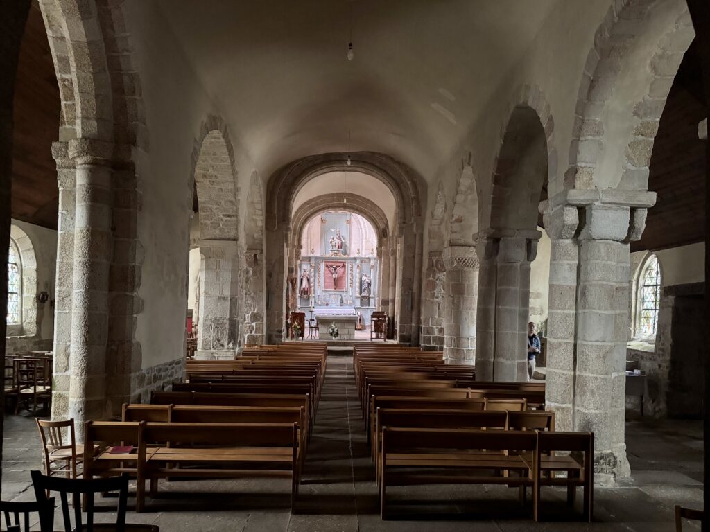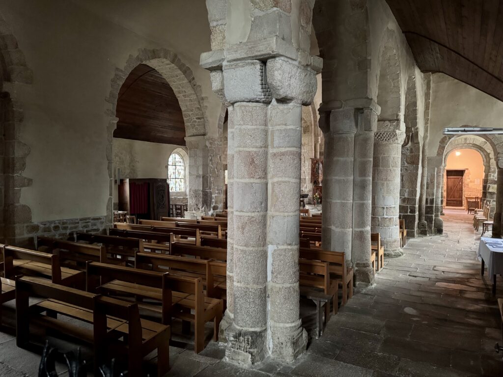 Église Saint-Beheau de Priziac。交差部と身廊の南側の支柱にロマネスク建築が残っています。柱頭彫刻が良いです。