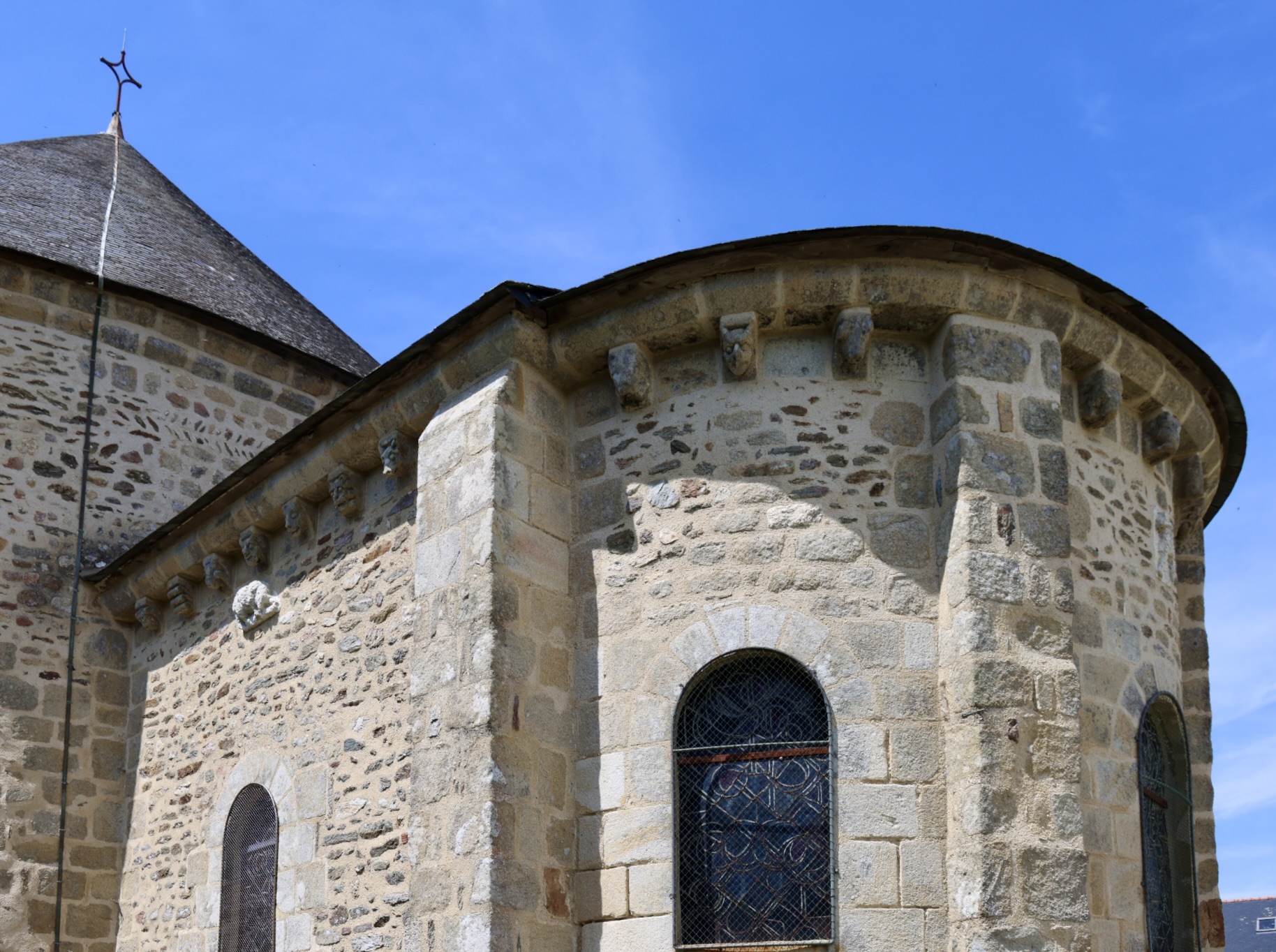 七つの高窓は、漏斗状の屋根に覆われているため、現在は光が入らない。その下には、四つの美しい柱頭(柱の装飾部分)が、ロマネスク様式のアーチで連結されている。内陣と周歩廊の柱頭は多様な影響を受けている:コリント式、ケルト様式、そしてロワール地方の様式である。