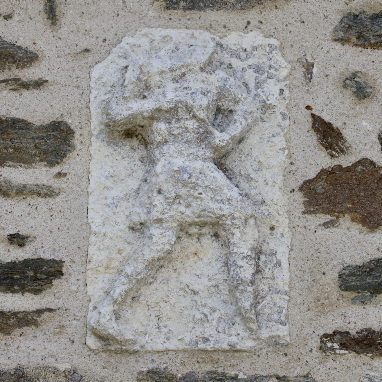 窓の上に埋めこまれた三つの石に彫刻があります。