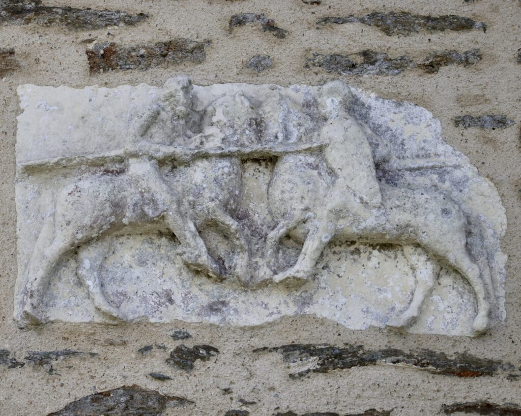 中央の祭室に埋め込まれた彫刻の中では、騎士同士の戦いが際立っている。これは12世紀初頭、パリでフランス人騎士と対峙したジョフロワ2世公を描いたものとされている。