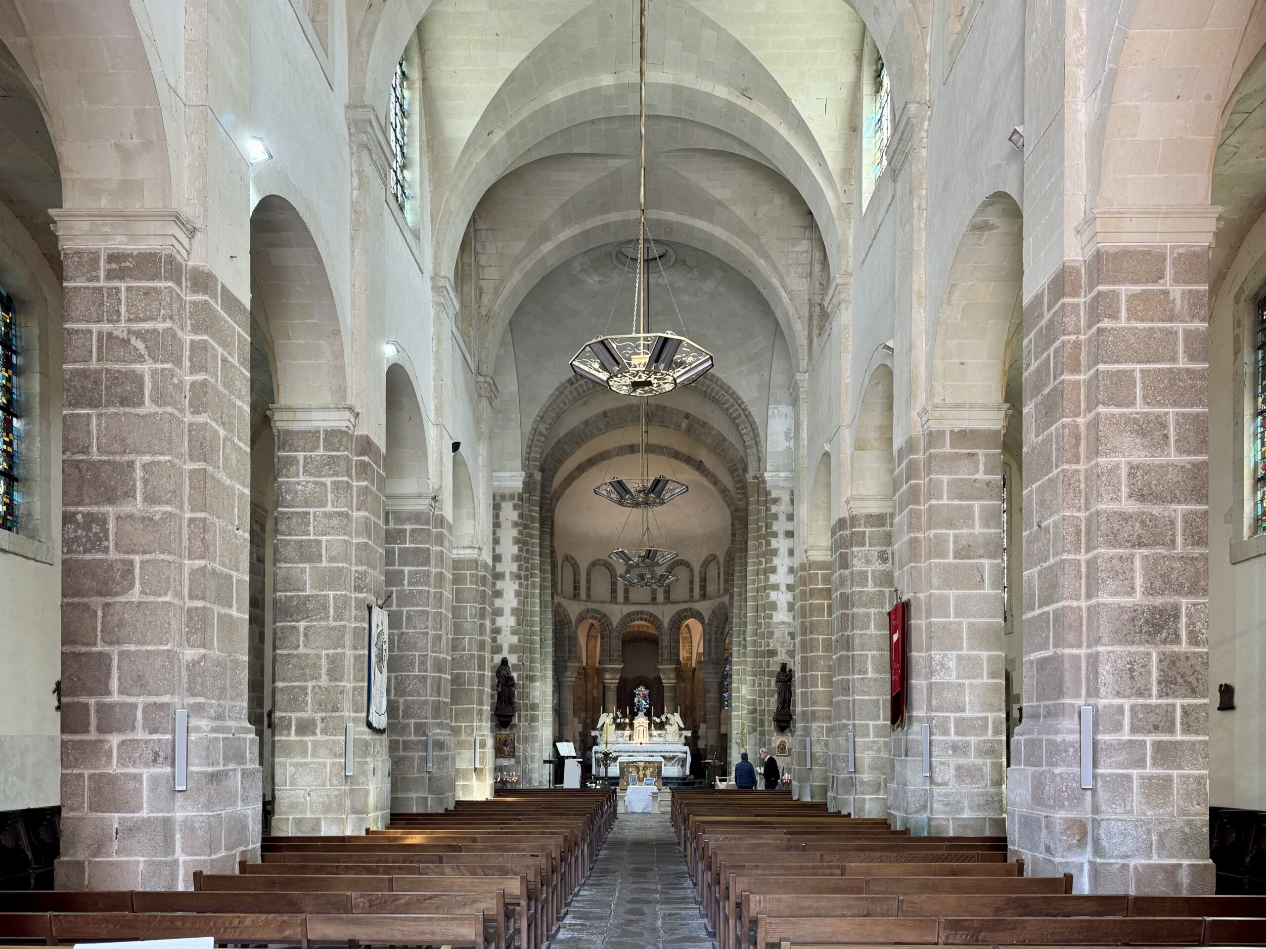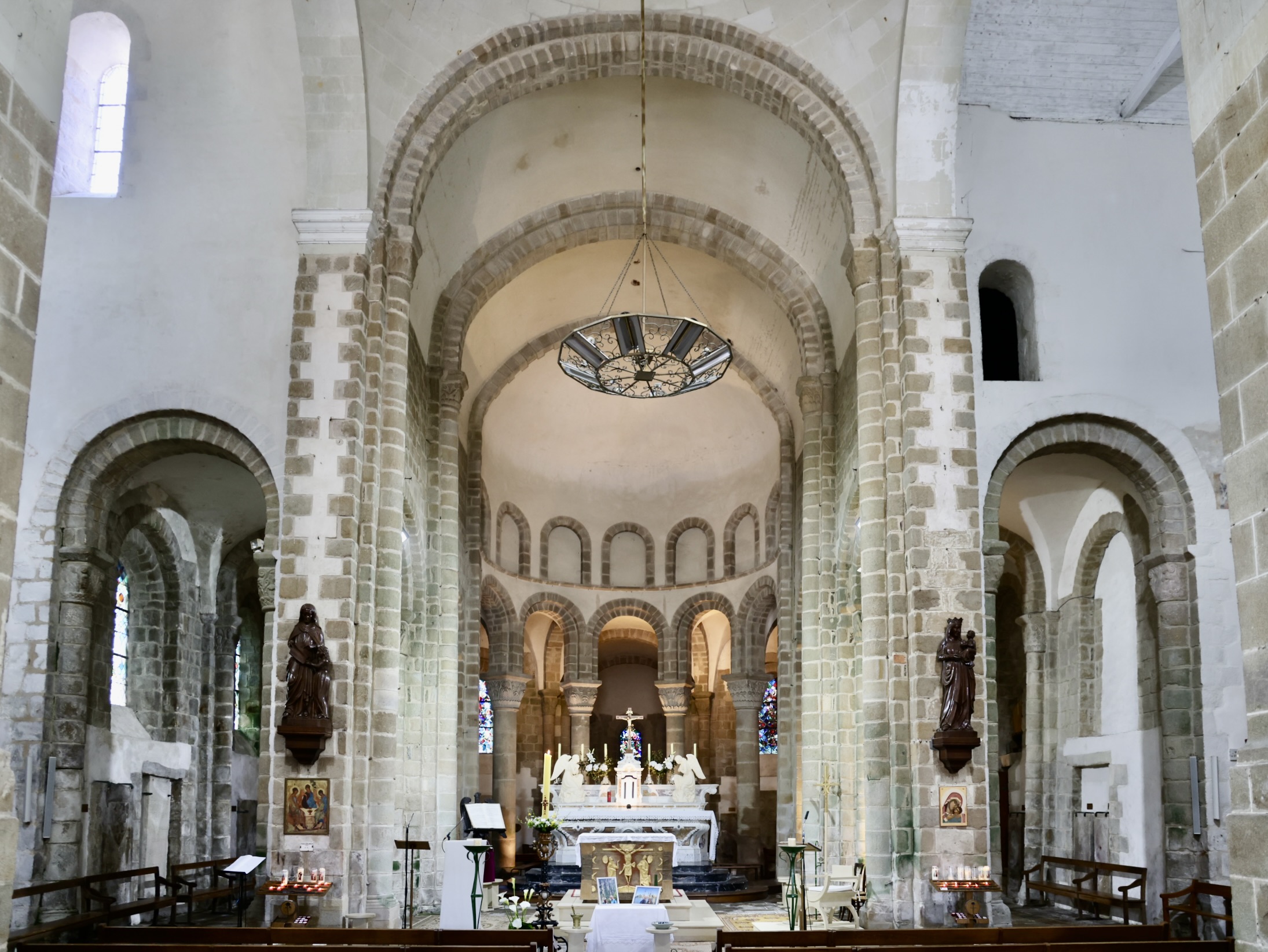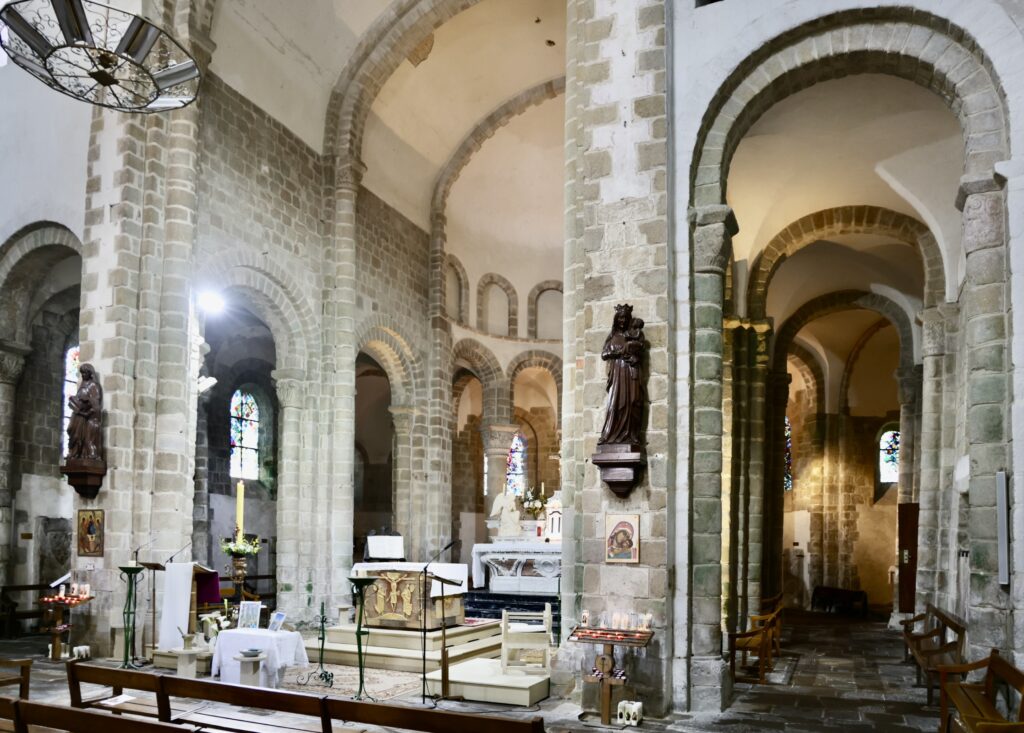 後陣、周歩廊、内陣、交差部はロマネスク様式(11~12世紀)だが、身廊は17世紀末に再建されたため対照的である。