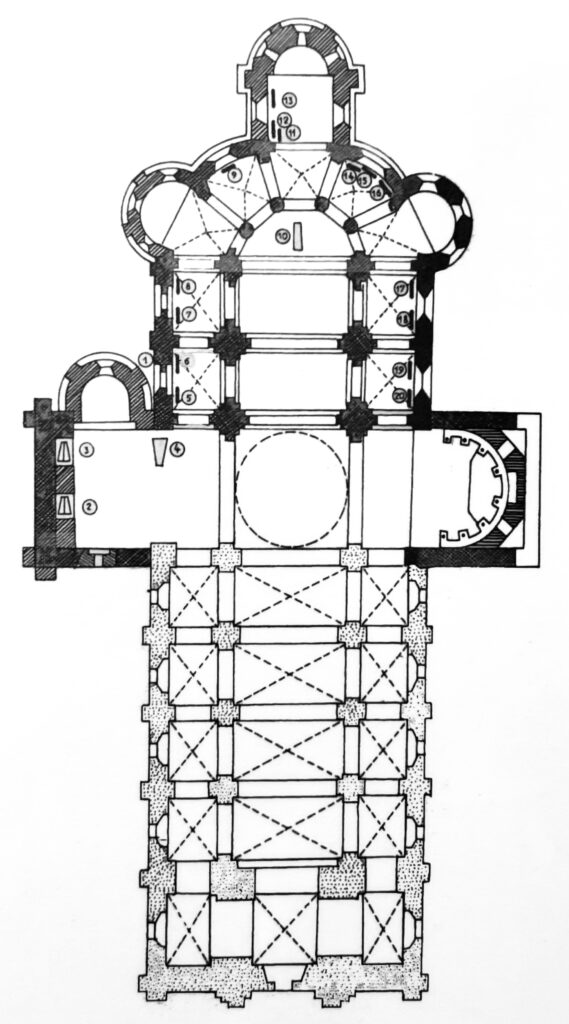 他の偉大なロマネスク建築と同様、この修道院教会はラテン十字形をしている。11世紀の20年代に着工され、12世紀初頭まで建設が続けられた。